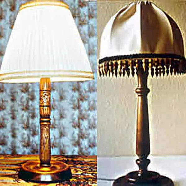 zwei TischlampenBei den beiden Tischlampen auf dem Foto (ältere Arbeiten) wird das Anschlußkabel jeweils durch die Lampensäule geführt. Die Säule der rechten Lampe wurde dazu auf der Drechselbank durchbohrt. Bei der linken Lampe wurde die Säule vor dem Drechseln aus zwei Hälften verklebt, nachdem in eine der Hälften eine Nut eingefräst wurde. Durch die Schnitzerei wurde die Klebefuge fast völlig kaschiert.