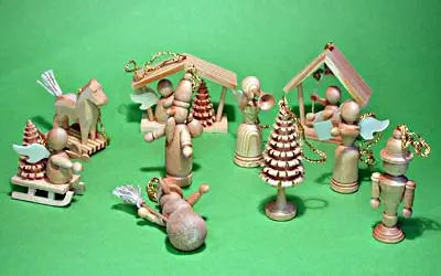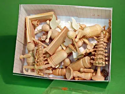 Bevor wir nun mit dem Zusammenkleben der zahlreichen linksgedrehten Einzelteile beginnen können, ist noch einiges zu erledigen. So müssen einige der Teile zusätzliche Bohrungen erhalten, in die z.B. die Engelsflügel oder die Trompete eingeklebt werden können. Einige Teile müssen auch leicht beschnitzt werden. (Die großen Engel z.B erhalten einen abgeflachten Rücken und ebene Flächen zum Ankleben der Arme usw.) Außerdem werden noch Teile benötigt, die sich nicht auf der Drehbank fertigen lassen. Einige sind auf der nebenstehenden Zeichnug zu sehen, weitere, wie die Teile für das Haus und die Kirche sind auf der Werkzeichnug im Downloadbereich zu finden. Wenn ich dennoch etwas vergessen haben sollte, werden Sie es sicher mit etwas Phantasie leicht ergänzen können. Überhaupt möchte ich Sie ausdrücklich dazu ermutigen, auch eigene Wege zu verfolgen, und meine Vorschläge und Anregungen nach Ihren Ideen und Möglichkeiten abzuwandeln und zu erweitern. Im Bereich Tipps und Tricks ;meiner Site finden Sie noch weitere nützliche Informationen z.B. zur Verarbeitung von Pergament.