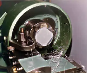 Bild 1: Mein Kaleidoskop. Davor ein Kameraobjektiv zum Größenvergleich.Zu den zahlreichen Übungsstücken, die ich angefertigt habe, um mich auf meine Drechsler- Gesellenprüfung vorzubereiten, gehörten auch die gedrechselten Teile für ein kleines Spielzeugkaleidoskop. Es versteht sich wohl von selbst, dass diese Arbeit bei mir den Wunsch weckte, die Einzelteile durch ein entsprechendes Innenleben zu ergänzen.