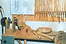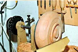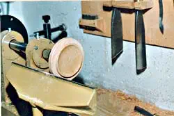 Bild 6: Fertigstellen des Halterähmchens auf einem dafür angefertigten Futter aus Rotbuche.Um das Halterähmchen für den Spiegel fertig drechseln zu können, habe ich ein entsprechendes Hilfsfutter aus einer passenden Rotbuchen-Querholzscheibe gefertigt, die ich mittels Schraubenfutter (ebenfalls noch Multimax-Zubehör!) an der Spindel befestigt habe.