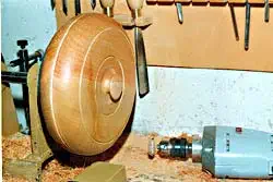 Bild 9: Auch für den Deckel fertige ich nun noch ein hölzernes Hilfsfutter an.Wer meine Arbeitsschritte aufmerksam bis hierher mitverfolgt hat, wird sich beim betrachten des nebenstehenden Bildes wahrscheinlich fragen: "Wozu dient jetzt noch ein Aufnahmefutter für den Deckel? Der war doch bereits fertig gedrechselt!"