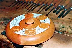 Bild 1: Griff und Deckel sind aus einem Stück gedrechselt.Die in die beiden Deckel eingfrästen Verzierungen habe ich in meinem Entwurf durch geschnitzte Ornamente ersetzt. Zum einen standen mir ja Oberfräse und Guillochiereinrichtung damals nicht zur Verfügung. Außerdem konnte ich so meine Fähigkeiten die ich mir als Kind in der Bildhauerei meines Vaters angeeignet hatte mit in das Projekt einfließen lassen. Und: So unterschied sich mein Entwurf um ein weiteres Detail vom Original!