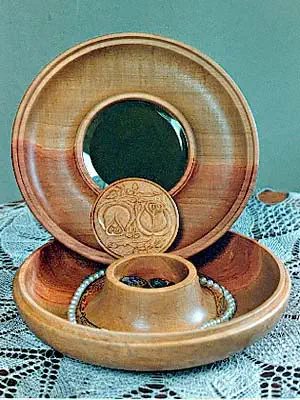 Schmuckdose geöffnet: An der Deckelinnenseite ist ein Spiegel montiert.Über das "Ja, ich solle mich umfassend mit den Unfallverhütungsschriften der Berufsgenossenschaft befassen und umgehend eine Werkzeichnung für mein praktisches Gesellenstück zur Genehmigung vorlegen!" war ich dann doch recht erschrocken! Jedem, dem ich Ausrüstung und Materialvorräte über die ich damals verfügte, gezeigt hätte, hätte mich sicher für verrückt erklärt! In Windeseile haben mir ein paar Freunde geholfen, die klapprige Eigenbau-Drechselbank meines Vaters nochmal so herzurichten, dass sie überhaupt als solche zu erkennen war. Bisher hatte ich Einzelteile davon bei Bedarf provisorisch auf meiner Bildhauerbank befestigt! Spärlich waren auch meine Holzvorräte! Die größte und stärkste Bohle die ich besaß, war ein Stück Birnbaum. Beim Nachsinnen, was daraus wohl entstehen könnte, fiel mir eine Abbildung aus dem Spannagel ein, die eine Schmuchdose zeigte, so ausgehölt war, dass eine ringförmige Vertiefung zur Aufbewahrung von Halsketten um die stehen gelassene Wandung eines kleinen Döschens im Zentrum herum verlief, welches Ringe und ähnliche kleine Schmuckstücke aufnehmen kann. Die Anfertigung meiner Werkzeichnung war ein Puzzlespiel: Ich wollte die Abmessungen des vorhandene Holzes so gut wie möglich ausnutzen, musste aber besonders bei der Bohlenstärke aufpassen, dass ich den Entwurf später auch maßhaltig umsetzen kann. Auch musste ich eigene Ideen einbringen, die meine Umsetzung vom Vorbild hinreichend unterscheiden.