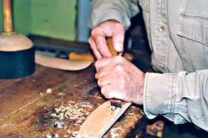 I chose pearwood as the wood for my shoehorn; it has a beautiful reddish-brown color, is fine-pored and hard. Beginners in particular should make sure that the growth is as straight as possible so that the wood does not offer too much resistance to our efforts to achieve a beautiful symmetrical shape and a profile in which the inner shape of the throat follows the outer shape. After all, a utility object not only has to look good, it also has to feel good! When preparing the work wood you should always remember: keep one, give two away! So cut a few suitable strips with the circular saw and then apply the downloaded (or even better: self-made!) template in front view and side view Transfer workpiece. It is best to drill the hole for the leather strap to hang up our shoe horn in a drill press while the workpiece is still rectangular. You don't have to buy a band saw to saw out the contours; a pendulum jigsaw or, as shown in my photos, a scroll saw can do that too. Even if it is cold, please do not burn the waste immediately! With double-sided adhesive tape or small nails, which can only go through parts that are outside the finished shape, they are still useful when sawing out the second contour, offset by 90 degrees. Our pear wood is too hard to hold in your hand while carving. So everyone has to look for the best possible clamping option in their workshop. For me, optimal means that the workpiece should be at an ergonomic working height. The workpiece should be clamped to the workbench with an intermediate layer made of softer waste wood, as a beginner in particular cannot rule out the possibility of it slipping. For the same reason, clamping should be carried out in such a way that it is virtually impossible for the tool cutting edge to accidentally hit metal clamping parts such as bench hooks, vice jaws, etc. (It's better to re-clamp more often than to grind huge nicks out of the sculptor's chisels!) A single, slightly curved chisel is sufficient for carving. To get the final, smooth and curved shape, we will use rasps and coarse files, and finally sandpaper of different grits. If the shape and surface are ultimately flawless, I recommend wiping the workpiece with a cloth dampened in hot water and, after it has completely dried, sanding all the fibers that have straightened up again as a result of this so-called watering until smooth again. This step is particularly important if coloring is to be done by staining.