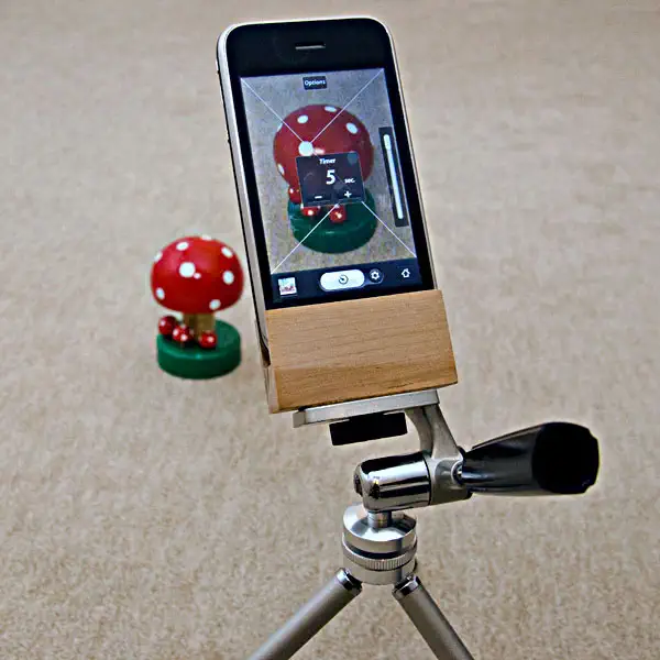 Ein Lindenholzklötzchen (aus der Abfallkiste!) habe ich mit einem passenden Schlitz zum Einklemmen des Smart-Phones und einer 1/4''-Gewindebohrung für die Stativschraube versehen. So ist in wenigen Minuten und ohne Kosten ein Adapter entstanden, mit dem ich die integrierte "Handy"- Kamera auch mit einem Stativ benutzen kann. Wenn ich bisher viele Fotos für Schritt-für-Schritt-Anleitungen in meiner staubigen Holzwerkstatt angefertigt habe, tat mir meine Spiegelreflex-Kamera immer ein bischen leid! Da scheint mir so ein Mobiletelefon doch weitaus staubdichter zu sein! Doch: "Ein Wunsch, ist er erfüllt, kriegt augenblicklich Junge!"