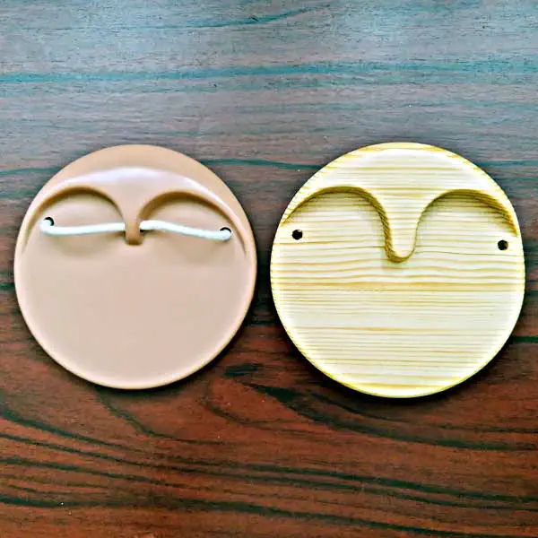 Links im Bild der Sockel aus Plaste als Muster. Das rechte Teil habe ich aus Fichtenholz nachgearbeitet: Der kreisförmige Rohling wurde auf der Bandsäge ausgeschnitten und auf der Handdrechselbank vorgearbeitet und anschließend mittels Hobby-CNC- Maschine gefräst. Die Fertigbearbeitung (3 Bohrungen für den Haltegummi und Abrunden der Kanten mittels Sandpapier) erfolgte manuell.