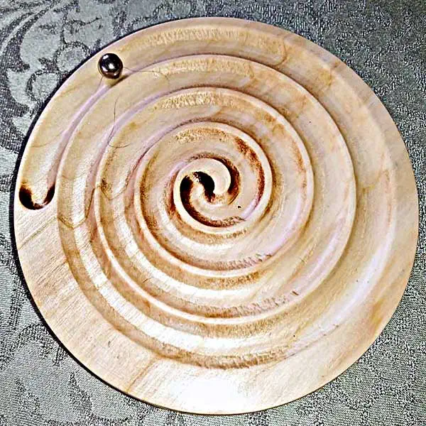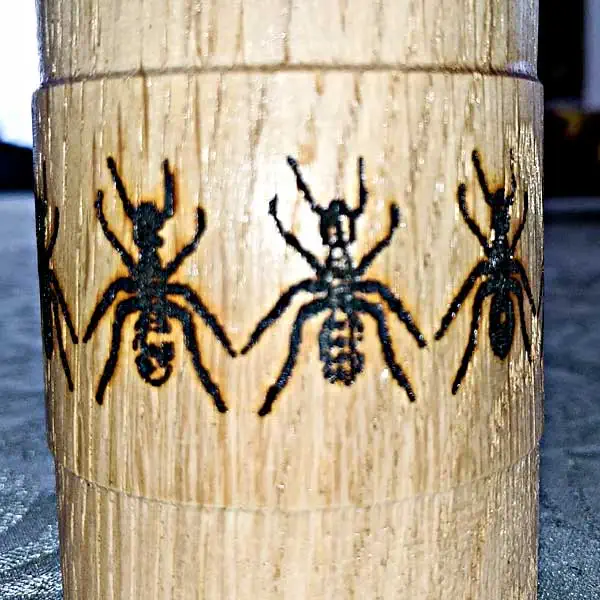 Sowohl mit meinem Lasergravierer, als auch mit meinem zur CNC-Fräse aufgerüstetes DBF-Gerät habe ich nun etliche handgedrechselte Holzteller mit Lasergravuren bzw. gefrästen Ornamenten verziert. Da wäre es doch wünschenswert, wenn ich auch die Mantelfläche gedrechselter Langholzteile weiterbearbeiten könnte! Dazu braucht es eine CNC-Rotationsachse (manchmal auch als CNC-Rotationstisch bezeichnet). Im Internet findet man zwar neben Präzisionachsen, für professionelle Anwender, deren Preise den Wert einer kompletten Hobbyfräse um ein vielfaches übersteigen, durchaus auch bezahlbare Achsen für Hobbyanwendungen, aber vielleicht kann ich ja aus vorhandenen Teilen zumindest eine Variante für arme Leute zusammenstellen! Mein erster Aufbau - vorhandenes Mini-Drechselfutter direkt an einen Schrittmotor angeflanscht - ist natürlich zu schwach, um damit zu fräsen. Für einen Test mit dem Lasergravierer sollte es aber reichen. Um das Motiv exakt auf den Umfang zu verteilen, ist etwas Rechenarbeit angesagt. Das klappt bei mir leider erst beim zweiten Versuch, wie man an den eingebrannten Punkten erkennt.