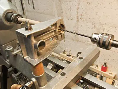 Meine BohrbrilleFür gelegentliche Tieflochbohrarbeiten in Hobbywerkstatt wäre der Kauf einer Bohrbrille eine recht teure Anschaffung. Da nicht für jede Drechselbank passende Bohrbrillen zu finden sind, kämen in solchen Fällen auch noch Anpassungskosten eines Fremdfabrikates an das jeweilige Bankbett und an die exakte Spitzenhöhe hinzu. Aber selbst ein - stabiler - Eigenbau macht einige Arbeit. Darum habe ich erst einmal alle Ecken meiner Werkstatt durchstöbert, ob sich nicht irgendwo wenigstens "die halbe Miete" findet. Und: Ich bin fündig geworden! EinTeil des Bohrständers der längst in Vergessenheit geratenen Multimax-Bohrpistole aus DDR -Zeiten sieht fast schon aus, wie eine professionelle Bohrbrille! Während ich weiterkrame, um geeignetes Material zum Anpassen der Spitzenhöhe und zur Befestigung am Bankbett zu finden, kommt mir eine Idee: Da ich ja während des Bohrvorganges die Handauflage nicht benötige, kann ich das Handauflagenunterteil zur Befestigung meiner Bohrbrille nutzen! Damit ich die Spitzenhöhe nicht jedesmal neu einrichten muss, drechsle ich noch eine passende Distanzrolle aus Rotbuche, die auf den 1" starken Aufnahmeschaft aus Stahl passt. Wenige Augenblicke später starte ich eine Probebohrung mit meiner neuen Bohrbrille und einem extra langen Spiralbohrer.