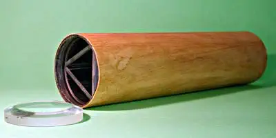 Bild 1: Mein Kaleidoskop. Davor ein Kameraobjektiv zum Größenvergleich.Zu den zahlreichen Übungsstücken, die ich angefertigt habe, um mich auf meine Drechsler- Gesellenprüfung vorzubereiten, gehörten auch die gedrechselten Teile für ein kleines Spielzeugkaleidoskop. Es versteht sich wohl von selbst, dass diese Arbeit bei mir den Wunsch weckte, die Einzelteile durch ein entsprechendes Innenleben zu ergänzen.