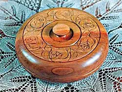 Bild 1: Griff und Deckel sind aus einem Stück gedrechselt.Die in die beiden Deckel eingfrästen Verzierungen habe ich in meinem Entwurf durch geschnitzte Ornamente ersetzt. Zum einen standen mir ja Oberfräse und Guillochiereinrichtung damals nicht zur Verfügung. Außerdem konnte ich so meine Fähigkeiten die ich mir als Kind in der Bildhauerei meines Vaters angeeignet hatte mit in das Projekt einfließen lassen. Und: So unterschied sich mein Entwurf um ein weiteres Detail vom Original!