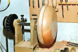 Bild 6: Fertigstellen des Halterähmchens auf einem dafür angefertigten Futter aus Rotbuche.Um das Halterähmchen für den Spiegel fertig drechseln zu können, habe ich ein entsprechendes Hilfsfutter aus einer passenden Rotbuchen-Querholzscheibe gefertigt, die ich mittels Schraubenfutter (ebenfalls noch Multimax-Zubehör!) an der Spindel befestigt habe.
