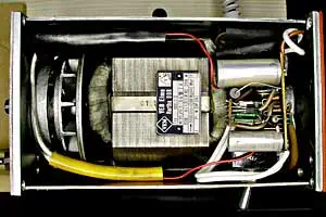 Bild 2: Blick ins Innenleben der Drechselbank: Der Kollektormotor stammt aus einer ausgesonderten Labor- Tischzentrifuge. Die Bauelemente des Drehzahlreglers sind gut erkennbar.