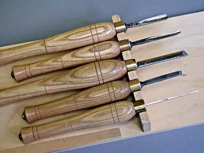 Also habe ich von den Beiteln, die sich bisher als am nützlichsten erwiesen hatten, die die alten Hefte entfernt, eventuellen Rost entfernt, die Werkzeugblätter sauber poliert und die Schneiden neu geformt und geschärft. Um die Beitel recht „professionell“ aussehen zu lassen, habe ich Eschenholzhefte gedrechselt und nach dem Vorbild der der englischen Marke „Robert Sorby“ mit einer Messingzwinge versehen sowie den Körnerabdruck mit einem Messingziernagel „versteckt“. So entstanden eine Schrupp- und eine Formröhre (Bildhauerbeitel Stich 6, 10mm bzw. 5mm und aus einem Balleisen (Stich 1, 5mm) entstand kleiner Meißel. Ein Graveurstichel, ergab nach Umschleifen der Schneide schließlich eine Art Ovalmeißel, mein absolutes Lieblingswerkzeug, das ich mir manchmal auch zum „normalen“ Drechseln „ausleihe“. Die bei weitem meiste Schleifarbeit hatte ich bei der Anfertigung eines schmalen Abstechstahls, denn ich fand keinen passenderen Rohling als ein altes Küchenmesser. Diese fünf Werkzeuge sind bis heute meine wichtigsten geblieben und nur in seltenen Ausnahmefällen nehme ich andere Beitel hinzu.