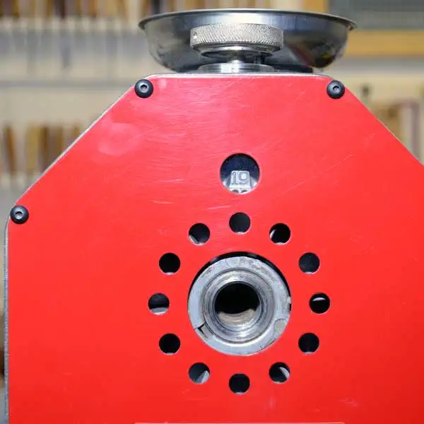 Um die rot lakierte Rückwand des Spindelkastens abnehmen zu können, muss zunächst das Handrad abgeschraubt werden. Dazu arretiere ich die Spindel mit dem Arretierbolzen der Teileinrichtung. Die als Zubehör zur Drechselbank gelieferte Auswerferstange dient - durch die dafür vorgesehenen Bohrungen im Handrad gesteckt - dabei als Hebel. Drehen im Uhrzeigersinn löst das Handrad. Nun entferne ich mittels 2,5mm Imbusschlüssel die acht Befestigungsschrauben der Rückwand.