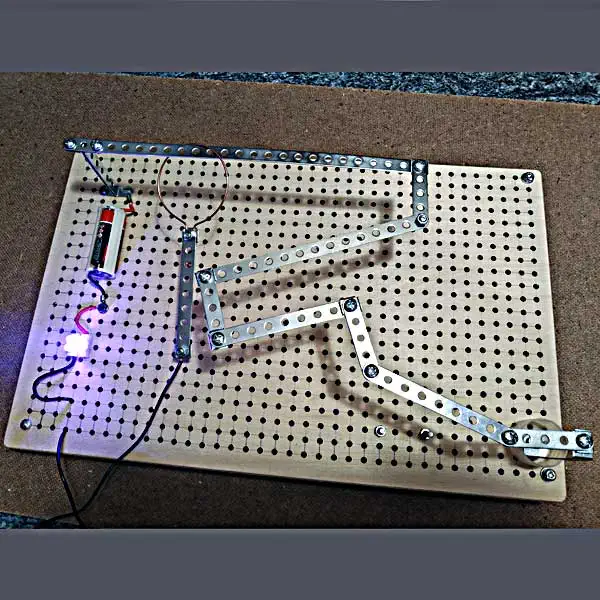 To test the dimensional accuracy of the plotted drawings, I created a grid in Inkscape with 10mm line spacing and had the plotter draw it on a sheet of plywood. This time the WOW! effect is inevitable! The drawing on the rough wooden surface is very clean and true to size! But: Can you make something breakable out of the record? Sure, of course! I carefully mark the intersection points and drill 4.1mm holes. Pure hard work! This is how a versatile experimental board was created and I hope to be able to use it to teach my grandson a few basics of electrical engineering! The illustration shows a variant of a skill game in which the aim is to follow a given path without touching it. - Much faster than expected, a first useful application example for my new pen plotter was created! And: If grandpa doesn't lose patience and grandson loses interest, perhaps there will be an "Electrical Experiments" category here!