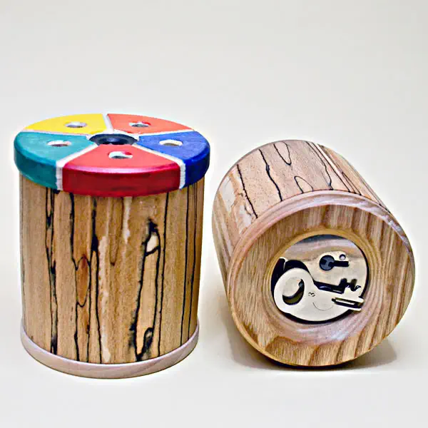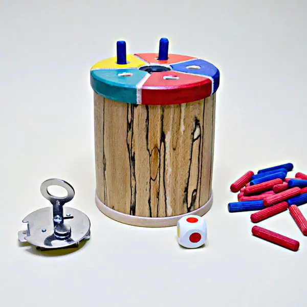 I have to make space in the workshop first! But stop! The roughly pre-turned blanks made of bush-hammered beech, which were actually intended to be used to make money boxes, would make pretty containers for the game! It's just a shame that the money box locks are left behind. But if the game leader could carefully close the can before the game starts, everyone would know: “There is no cheating here!” I like the new feature and I also buy the design version with colored dice, which is particularly suitable for smaller children who are not yet confident can handle numbers enough, a money box lock.