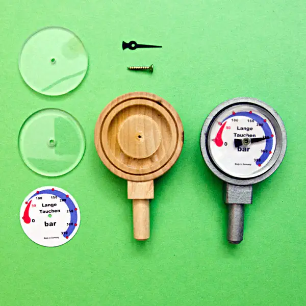 I particularly enjoy making the two pressure gauges (called finemeters by divers - you never stop learning!): I first design the scale on the computer. I then look for a leftover piece of acrylic glass for the cover glass, but can't find anything of the right thickness. At first I'm reluctant to simply place two slices on top of each other. But then I came up with the idea of arranging the pointer between the two disks. As with the original, this creates a distance from the scale, which can be clearly seen in the shadow cast on the scale. I am thrilled with the (intermediate) result!