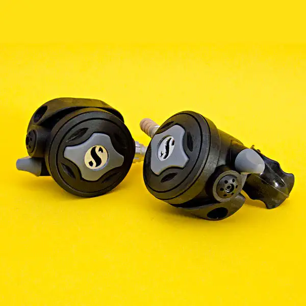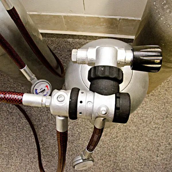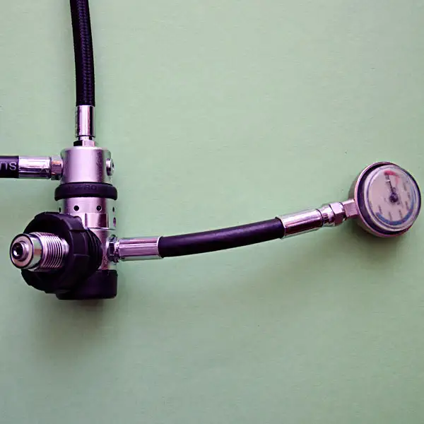 For the “wiring” of the individual components, I chose an inexpensive garden hose from the hardware store. I implemented the (missing) pressure hose screw connections using wooden tenons with the external shape of hose olives. Each regulator has three connections: (scuba regulator, wetsuit, pressure gauge).