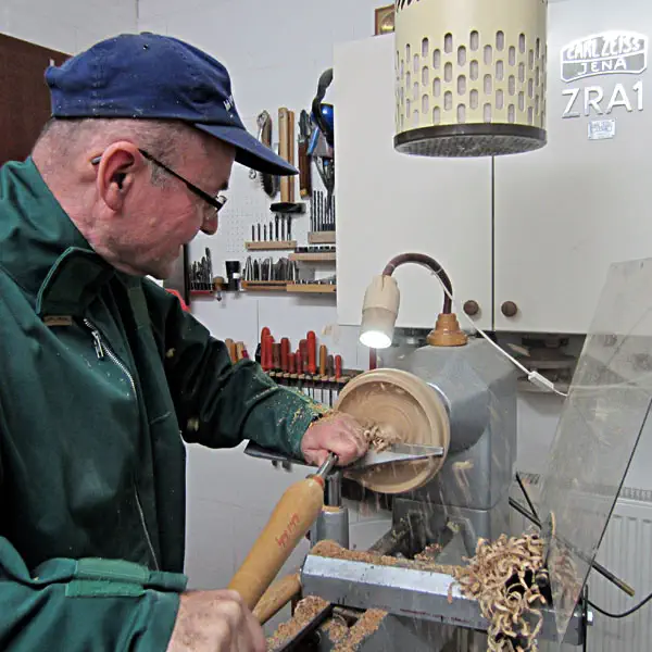 Choosing wood for the bottle heads is not easy for me: most of the wood I have in the right size is simply too good for this purpose! Finally, I select a section of a half-trunk of birch tree. I immediately turn the two workpieces roughly so that they can dry out a little if necessary. I made my choice well: the wood does have some flaws. It would hardly ever have resulted in extraordinary bowls. I find suitable blanks made of ash for the bottle bases. I have the most fun making the small valve knobs: it's not for nothing that I've chosen the word "Miniature" as my name!