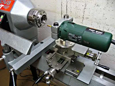 Höhere Genauigkeit und weitere Möglichkeiten bieten käufliche Bohr- und Fräseinrichtungen, die ebenfalls vom Handauflagenunterteil aufgenommen werden. Sie besitzen eine genormte 43mm Aufnahme für die Handbohrmaschine bzw. Oberfräse. Die Vorschubbewegung wird hier durch einen Schlitten mit Gewindespindel erreicht.