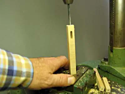 Bilder 4 und 5: Die benötigten Bohrungen und Aussparungen im Rumpf des Vogels werden mittels Ständerbohrmaschine eingebracht, solange das Werkstück noch plane Flächen hat. Die gewünschte Symmetrie und Rechtwinkligkeit wird so am besten gewährleistet.