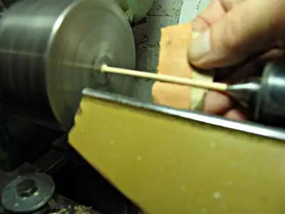 Den Ast, auf dem der Kuckuck sitzen soll und ein Rohling für Schnabelunterteile können, wie auf den Bildern 6 und 7 gezeigt, auf einer kleinen Drechselbank zylindrisch gedreht werden. Steht diese nicht zur Verfügung ist etwas mehr Schnitz- und Schleifarbeit angesagt.