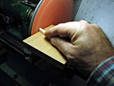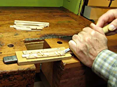 Bild 8: Die „Brustpartie“ des Kuckucks wird abgerundet. Um die Bearbeitung der kleinen Teilchen zu erleichtern gilt grundsätzlich, den Rest der Leiste möglichst erst am Schluss der Bearbeitung vom Werkstück abzutrennen, und so lange es geht als Haltegriff zu nutzen.