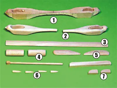 Bild 10 zeigt die benötigten Holzteile in verschiedenen Bearbeitungsstadien.
