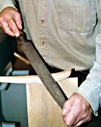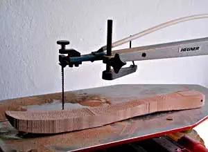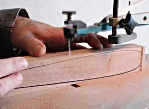 Als Werkholz für meinen Schuhlöffel habe ich Birnbaum gewählt, es hat eine schöne rotbraune Farbe, ist feinporig und hart. Besonders Anfänger sollten auf möglichst geraden Wuchs achten, damit uns das Holz nicht zu großen Widerstand entgegensetzt, bei unserem Bemühen eine schöne symmetrische Form und ein Profil zu erhalten, bei dem die innere Form der Kehle mit der äußeren Form mitgeht. Schließlich muss ein Gebrauchsobjekt nicht nur gut aussehen, sondern sich auch gut anfühlen! Beim Zurichten des Werkholzes sollte man „Immer dran denken: einen behalten, zweie verschenken!“, also gleich ein paar passende Leisten mit der Kreissäge zuschneiden und dann die herunter geladene (oder noch besser: selbst gefertigte!) Schablone in Vorderansicht und Seitenansicht auf das Werkstück übertragen. Das Loch für das Lederbändchen zum Aufhängen unseres Schuhanziehers bohren wir am Besten solange das Werkstück noch rechteckig ist, in einer Ständerbohrmaschine. Zum Aussägen der Konturen muss man nicht gleich eine Bandsäge anschaffen, die Pendelstichsäge oder wie in meinen Fotos gezeigt, eine Dekupiersäge schafft das auch. Auch wenn es gerade kalt sein sollte, die Abfallstücke bitte nicht sofort verbrennen! Mit doppelseitigem Klebeband oder kleinen Nägeln, die allerdings nur durch Teile gehen dürfen, die außerhalb der fertigen Form liegen, leisten sie noch gute Dienste beim Aussägen der zweiten, um 90 grad versetzten Kontur. Unser Birnbaumholz ist zu hart, um es beim Schnitzen in der Hand halten zu können. So muss jeder in seiner Werkstatt Ausschau nach einer möglichst optimalen Spannmöglichkeit selbst suchen. Optimal bedeutet für mich, das Werkstück sollte sich in ergonomischer Arbeitshöhe befinden. Das Werkstück sollte mit einer Zwischenlage aus weicherem Abfallholz auf die Werkbank gespannt werden, da besonders ein Anfänger nicht ausschließen kann, dass er auch mal abrutscht. Aus dem gleichen Grunde sollte das Einspannen so erfolgen, dass es praktisch ausgeschlossen ist, versehentlich in metallene Spannteile wie Bankhaken, Schraubstockbacken usw. mit der Werkzeugschneide zu treffen. (Lieber öfter umspannen, als riesige Scharten aus den Bildhauerbeiteln zu schleifen!) Zum Schnitzen reicht ein einziger leicht gewölbter Beitel völlig aus. Um die endgültige, glatte und schwungvolle Form zu erhalten, werden wir Raspeln und grobe Feilen, zum Schluss Sandpapier unterschiedlicher Körnungen einsetzen. Sind Form und Oberfläche schließlich ohne Tadel, empfehle ich, das Werkstück mit einem in heißem Wasser angefeuchteten Lappen abzuwischen und nach völligem Trocknen nochmals alle Fasern, die sich durch dieses so genannte Wässern wieder aufgerichtet haben, wieder glatt zu schleifen. Dieser Arbeitsgang ist besonders wichtig, wenn eine Farbgebung durch beizen erfolgen soll.