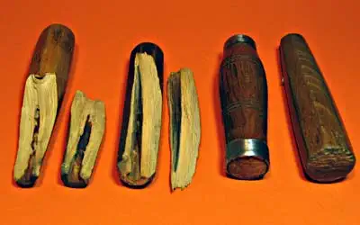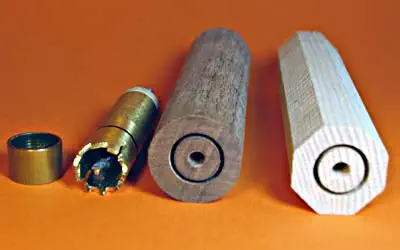 Wichtiger ist die Entscheidung, ob die Hefte mit einer Zwinge versehen werden sollen oder nicht. Die Hefte aller meiner Drechselwerkzeuge habe ich mit Zwingen versehen, die ich aus passendem Messingrohr angefertigt habe. Bei Bildhauerbeiteln finde ich solche Zwingen persönlich als nicht so schön. Andererseits zeigt ja Bild 1 eindrucksvoll, wie Hefte ohne Zwinge früher oder später einmal enden. So entschloss ich mich schließlich die Zwingen zu versenken. Bild 3 zeigt die Lochkreissäge, die ich mir für diesen Zweck aus dem gleichen Messingrohr angefertigt habe, aus dem ich auch die Zwingen gemacht habe. Der runde Rohling aus Nussbaum und der achteckige aus Esche sind bereits gebohrt und die vorbereiteten Ringe können eingeschlagen werden. Die Ringe sollten auf dem Holzkern straff sitzen und zu der äußeren hölzernen Ummantelung etwas Spiel haben. Das kann man erreichen, indem man entweder jeden zweiten Zahn der kleinen Kronensäge ganz leicht nach außen „schränkt“, oder indem man die Messingringe vor dem einschlagen außen etwas abschleift. Danach geht’s ans Drechseln bzw. aushobeln der Hefte. Wer eine Drechselbank besitzt kann auch bei den achteckigen Heften das hintere Ende schön ballig drechseln. Aber mit schnitzen und geduldigem schmirgeln kommt man ebenfalls zum Ziel.